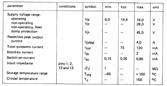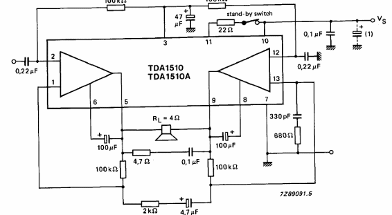 Este amplificador de 24 W para uso automotriz fue encontrado en el manual de circuitos integrados de Philips de 1990. La carga es de 4 ohms y la configuración es puente (BTL).