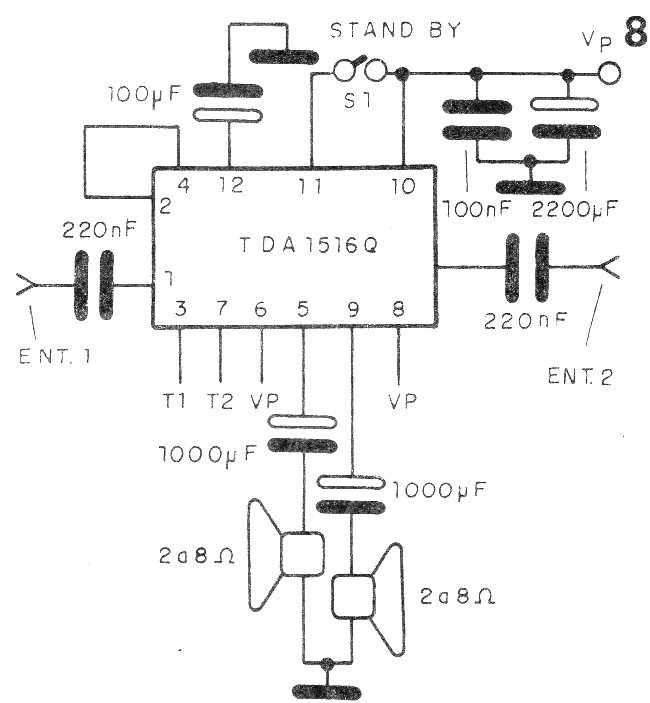 Este es un circuito comercial de Philips de los años 90. El circuito integrado debe estar dotado de buen disipador de calor y la fuente puede ser de 14,4 V o batería de coche. El circuito tiene un rango pasante de 20 a 15 000 Hz y la impedancia de entrada de 60 k ohms.