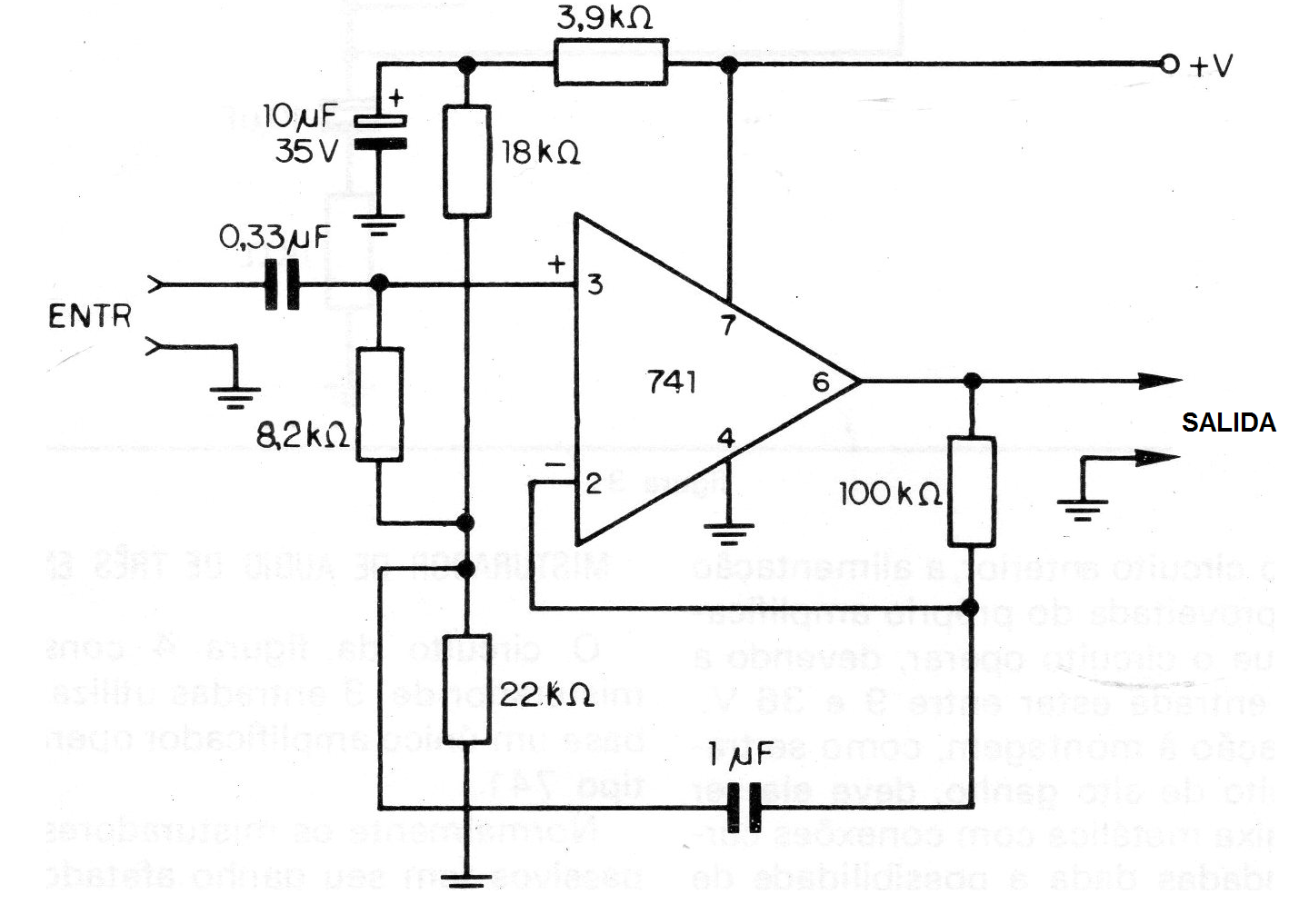 Esta versión de preamplificador es una de las muchas que el lector encontrará en este sitio usando el 741. Este circuito se encuentra en una documentación de 1977 y no necesita fuente simétrica. La alimentación se puede hacer con tensiones de 9 a 15 V y los cables de señal deben ser blindados.