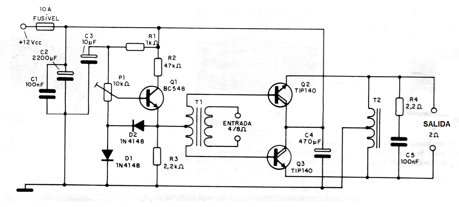 En realidad, este circuito encontrado en una documentación de 1992 no posee toda esta potencia. Se trata de un circuito reforzador en el que los transistores de salida deben estar dotados de disipadores de calor. T1 es un transformador con un primario de 110/220 V y secundario de 6 + 6 a 12 + 12 V con 200 mA. T2 consiste en 48 + 48 espiras de hilo 20 en un bastón de ferrita.
