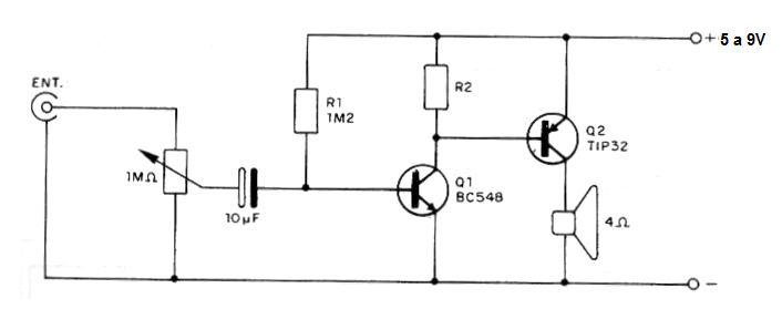 Este circuito puede ser utilizado como interfaz de sonido para circuitos de efectos controlados por un Arduino u otro microcontrolador. La alimentación puede provenir de una pequeña fuente de 5 a 9 V o del propio microcontrolador, ya que el consumo no es muy elevado, llegando a los 100 mA. Una resistencia de 22 ohms se puede conectar en serie con altavoz para reducir el consumo. El potenciómetro n la entrada ajusta el volumen. R2 se obtiene experimentalmente entre 220 ohms y 1 k para obtener un mejor rendimiento con menor consumo.