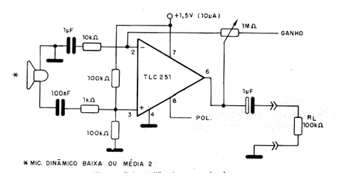 Este circuito fue sugerido originalmente Texas Instruments, pues se basa en uno de sus circuitos integrados, el TLC251. Este integrado es un amplificador operacional con transistores de efecto de campo LinMOS y puede operar con una tensión tan baja como la suministrada por una sola pila. Su consumo es de sólo 10 uA y proporciona buena señal de salida en la carga de 100 k ohms a través de micrófonos dinámicos de media y baja impedancia. El potenciómetro de 1 M ohms ajusta la ganancia para que la excitación del amplificador. en la entrada de polarización se puede aplicar una tensión que lleve el circuito a una respuesta simétrica.