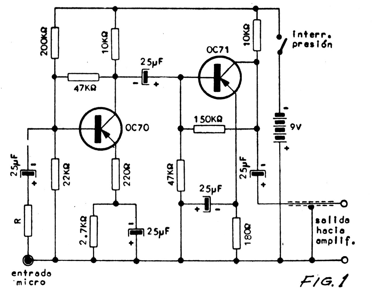 Este circuito fue obtenido en una publicación argentina de 1973. La versión original utiliza transistores de germanio que ya no son comunes actualmente. La resistencia R depende del tipo de micrófono. Para los micrófonos de cristal su valor es 47k; para micrófonos cerámicos de 100k y para micrófonos dinámicos, el valor depende de Z estando entre 2k y 10k.