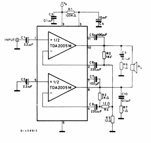 La tensión de funcionamiento de este circuito es de 18 V y la corriente de la fuente es de 3,5 A. El circuito es del manual de circuitos integrados lineales de la SGS de 1982. El circuito integrado debe estar dotado de radiador de calor.
