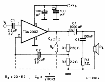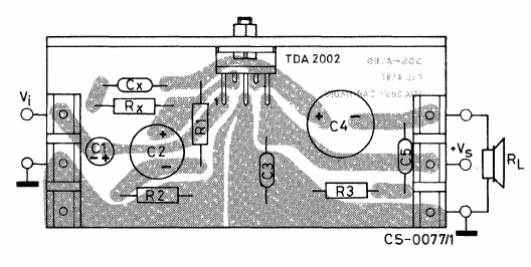 Este circuito puede ser alimentado por tensiones de 8 a 18 V teniendo la potencia de salida dependiente de esta tensión. El circuito integrado debe estar dotado de radiador de calor. La carga puede ser de 2 a 8 ohms. El circuito es del manual de circuitos integrados lineales de la SGS. La placa de circuito impreso se da junto al diagrama.
