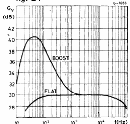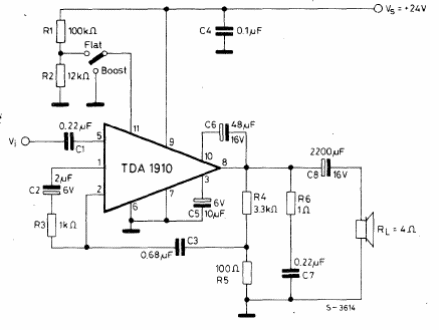 El circuito integrado utilizado no es común en nuestros días. El circuito presenta un refuerzo de graves según la curva dada junto al diagrama cuando la llave es accionada. La corriente de la fuente debe ser de al menos 1 A. El circuito es del manual de circuitos lineales de la SGS.