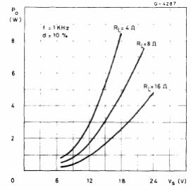 Este circuito básico de amplificador que puede ser alimentado por tensiones de 6 a 24 V tiene la salida dependiente de la impedancia y tensión de alimentación conforme al gráfico. El circuito es del manual de circuitos integrados lineales de la SGS de 1982. El circuito integrado usado es poco común en nuestros d