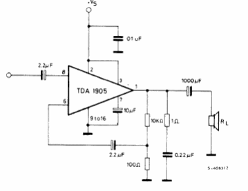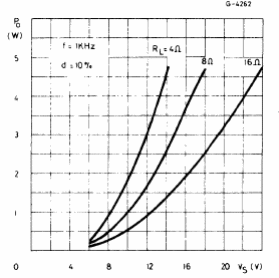 El circuito integrado utilizado en este amplificador, del manual de circuitos integrados lineales de la SGS de 1982, no es común en nuestros días. La potencia de salida depende de la alimentación y de la carga según el gráfico dado junto al diagrama.