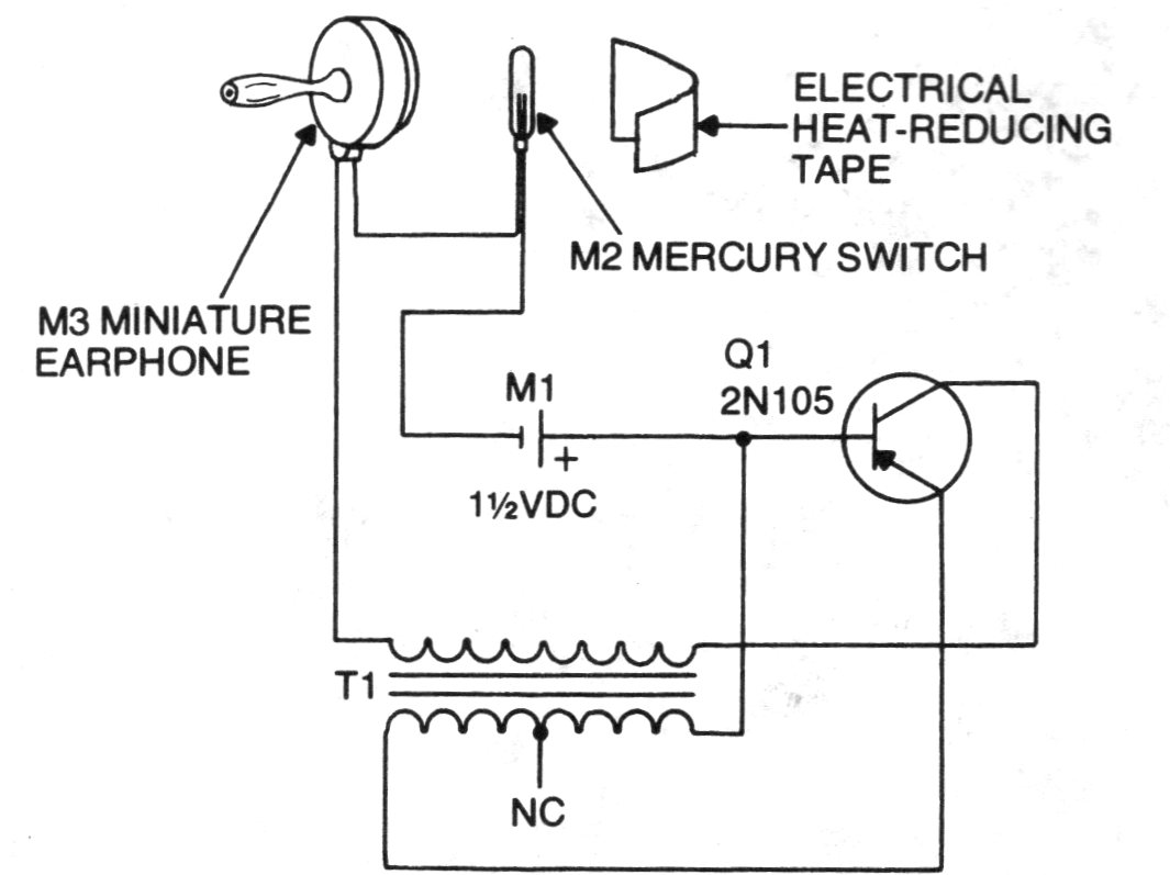 Este circuito emite un fuerte sonido en un auricular cuando el conductor que lo usa cabecea al estar en un estado de somnolencia. La alerta utiliza un transformador obtenido de radios transistorizados, un interruptor de mercurio y un auricular de baja impedancia. La alimentación se realiza por una sola pila pequeña o AAA.