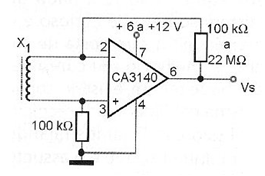 En la figura mostramos una configuración bastante usada para el CA3140. La alimentación de este circuito puede oscilar entre 6 y 12 V. Este circuito es ideal para operar con transductores de impedancias en el rango de algunos ohmios hasta 1 000 ohmios como micrófonos, sensores de pulsos, etc. La ganancia es dada por el resistor de realimentación, pudiendo ser alterado conforme la intensidad de la señal suministrada por el transductor.