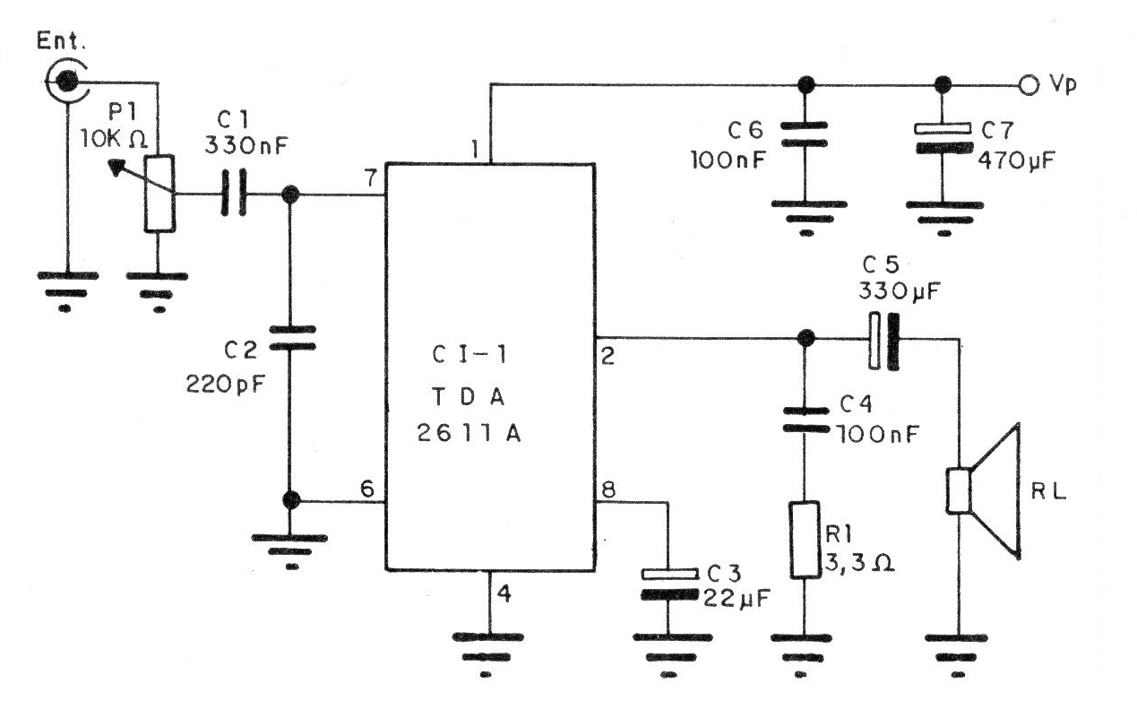 Este circuito utiliza el CI TDA2611A, no muy común actualmente, pero tiene buena potencia con excelente calidad de sonido. El circuito se utilizaba en equipos comerciales de la década de los 80. La alimentación es fea con tensiones de 18 a 22 V.