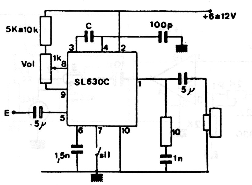 Este circuito utiliza un integrado difícil de encontrar actualmente y el auricular debe ser de alta impedancia. Encontramos este circuito en una publicación europea de los años 80. El condensador determina la respuesta de frecuencia del circuito, pudiendo estar entre 10 nF y 1 uF típicamente.