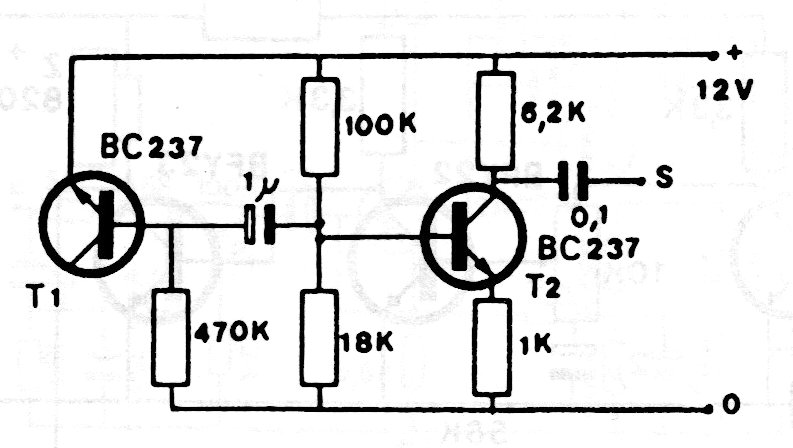 Este circuito aprovecha el ruido térmico de la junción de un transistor común, ampliándolo en el segundo transistor. La alimentación debe realizarse con tensiones de 12 a 18 V y la señal de salida debe aplicarse a un buen amplificador. Se pueden utilizar otros transistores NPN de uso general.