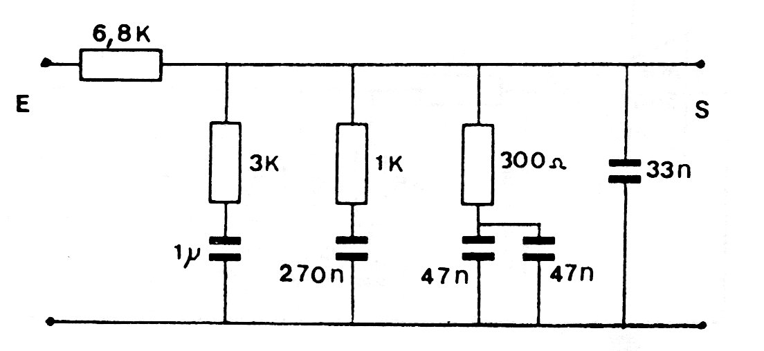 Conectando este circuito pasivo a la salida de un generador de ruido blanco (como el del circuito anterior), obtenemos un ruido rosa que se caracteriza por una reducción de la intensidad a medida que la frecuencia aumenta. El circuito requiere una buena amplificación en su salida, pues es pasivo.