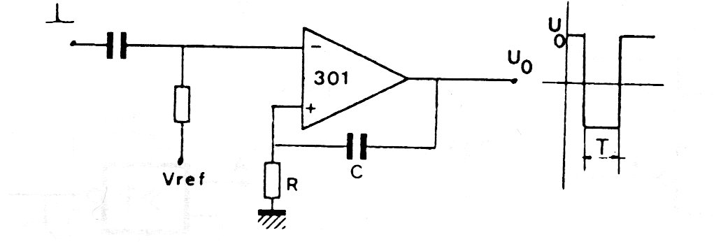 Esta configuración de monoestable con operacional se obtuvo en una documentación de los años 80. La fuente debe ser simétrica y el resistor de ref tiene valores típicos alrededor de 10 k. Operacionales equivalentes se pueden utilizar y la alimentación debe ser simétrica. R y C determinan la duración del pulso de salida.