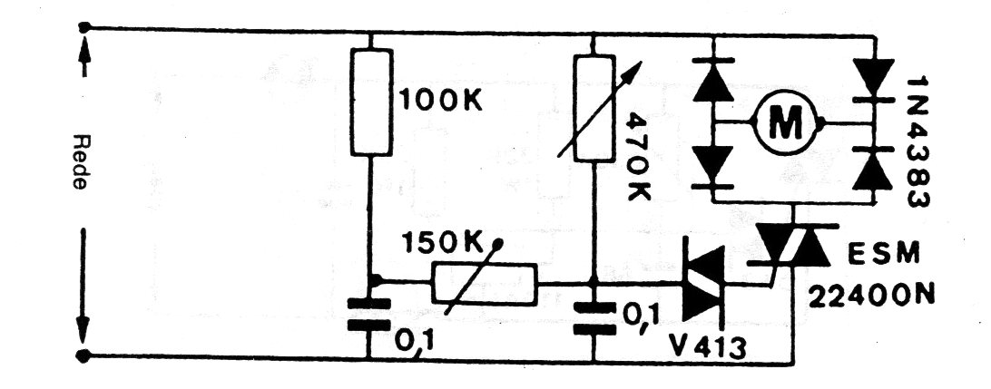 Encontramos este circuito en una documentación de los años 80. El triac y el diac son de tipos convencionales dependiendo de la potencia del motor controlado. Los diodos también deben soportar la corriente del motor controlado. El circuito funciona en la red de 110 V o 220 V necesitando eventualmente cambios de los capacitores.