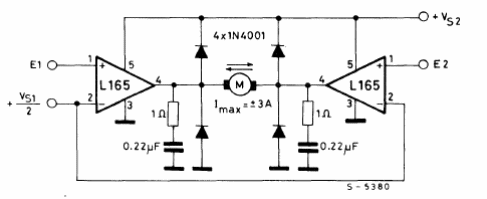 Encontramos este circuito en el manual de circuitos integrados de la SGS de 1982. El circuito es compatible con la lógica TTL y CMOS aplicada a las entradas E1 y E2. Vs2 debe ser mayor que Vs1 y la corriente máxima del motor es de 3 A con control bidireccional. Este circuito se puede utilizar como escudo para microcontroladores.