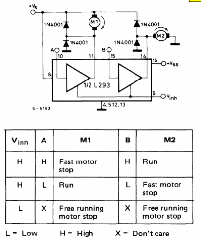 Este control para motores de hasta 1,5 A fue encontrado en el manual de circuitos integrados lineales de la SGS. El circuito integrado utilizado no es muy común actualmente y el circuito controla dos motores. Podemos utilizar este circuito como shield para microcontroladores.
