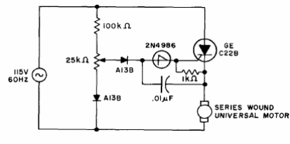 Este circuito utiliza una llave unilateral de silicio y un SCR en un control de motor de media onda. Se pueden utilizar SCR equivalentes. Encontramos esta configuración en el manual de semiconductores de GE de 1977.