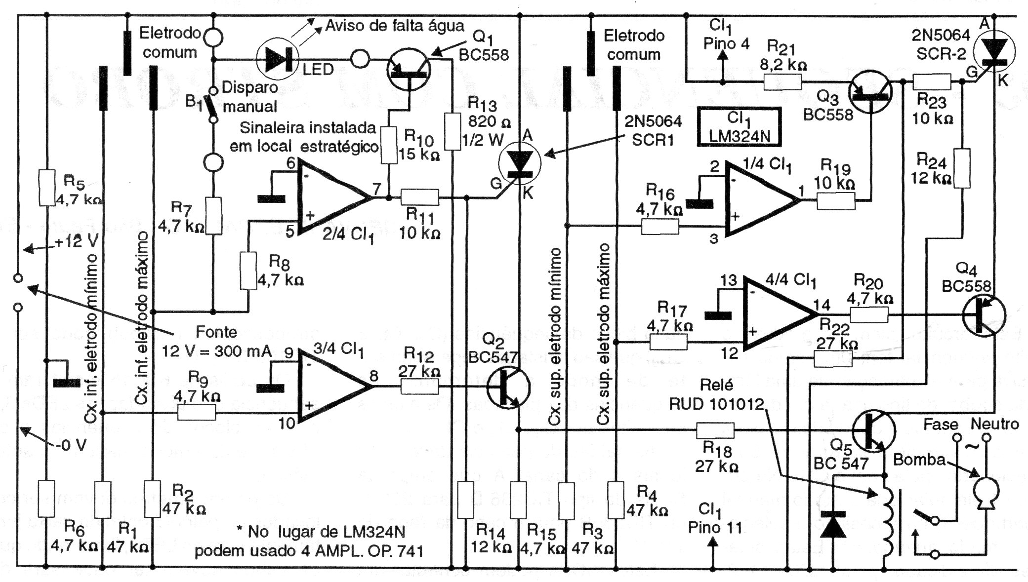 Este circuito es de una documentación de 1997. Su propósito es accionar una bomba de agua controlando el abastecimiento en dos cajas de agua. El proyecto utiliza electrodos de inmersión y componentes comunes que aún se pueden encontrar fácilmente en nuestro mercado. El SCR debe estar dotado de un disipador de calor.
