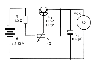 La manera más simple de controlar la velocidad de un motor de corriente continua es dosificar la corriente que circula a través de él. Esto se puede hacer con un potenciómetro o reóstato pero esta configuración tiene un problema: el reóstato o el potenciómetro disipa mucha potencia y tiende a calentarse. Esto significa que se debe utilizar un componente especial que además de caro no es muy fácil de obtener. Una posibilidad mejor consiste en utilizar un potenciómetro común en un circuito en el que un transistor es el que dobla la corriente a través del motor. Esta configuración se muestra en la figura y utiliza un transistor NPN de potencia que debe montarse en un radiador de calor. El potenciómetro P1 controla la corriente de base del transistor (de pequeña intensidad) que, a su vez, controla la corriente de colector que es la corriente principalmente del motor (de mayor intensidad). Combinando este circuito con un inversor de rotación podemos controlar de modo perfecto un motor, llevándolo a cualquier velocidad en cualquier sentido de rotación.