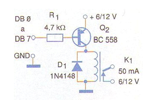 El circuito mostrado en la figura es la versión accionada en el nivel bajo, del circuito anterior (CIR2520S). Las características son las mismas del circuito anterior y de la misma forma, se pueden elaborar en la misma placa 8 circuitos iguales para el uso de todas las salidas del puerto paralelo o aún como shield para microcontroladores.