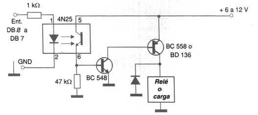 Para controlar relés de forma segura con un doble aislamiento por el puerto paralelo, sugerimos el circuito de la figura. El aislador óptico aísla el circuito del microprocesador o del PC del circuito de accionamiento de los relés, que puede funcionar con una tensión diferente de 5 V. En realidad, con el uso de relés de 12 V es posible obtener un mejor rendimiento. Los relés de 12 V son más fáciles de obtener, más sensibles y con ello pueden facilitar el montaje de la interfaz. La resistencia R1 debe tener su valor elegido de acuerdo con el tipo de acoplador óptico empleado para obtener el punto ideal de disparo con la señal de la puerta en el nivel alto. Una posibilidad para encontrar el mejor valor, consiste en usar en el desarrollo del proyecto un trimpot y luego sustituirlo por un resistor fijo. Teniendo en cuenta que los relés de 12 V comunes se especifican para una corriente de 50 mA, la fuente debe ser dimensionada previendo el instante en que todos ellos estén accionados. Por lo tanto, para una interfaz en la que se utilizan las 8 salidas del puerto paralelo, la fuente debe ser capaz de proporcionar los 400 mA requeridos.