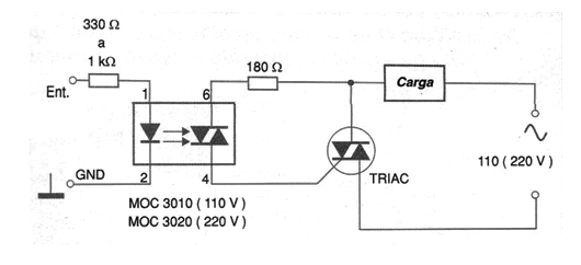 Para el disparo de cargas de alta potencia conectadas a la red de energía, nada mejor que usar TRIAC. Para este propósito se pueden utilizar acopladores ópticos con opto-diacs como los de la serie MOC3010 (110 V) y MOC302 (220 V). El circuito mostrado en la figura hace uso de un MOC3010 y está indicado para el disparo de cargas resistivas.