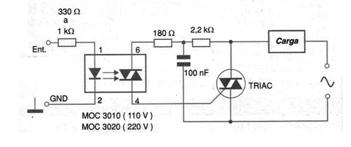 Para cargas inductivas tenemos la configuración mostrada en la figura. Observe que el acoplador óptico (aislador óptico) proporciona un aislamiento de 7 000 volts, lo que garantiza una seguridad total para el dispositivo de control, en el caso del ordenador. El triac debe estar dotado de un buen radiador de calor.
