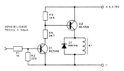 Este circuito consiste en una versión sensible de Shield que requiere una corriente muy baja del microcontrolador. Con este circuito se puede disparar un relé de 50 mA con una corriente de entrada de sólo 50 uA. El circuito sirve para relés de 6 a 15 V con corrientes de bobina hasta 50 mA..Este circuito dispara con el nivel alto en la entrada. Con transistores BD136 podemos controlar solenoides hasta 500 mA.