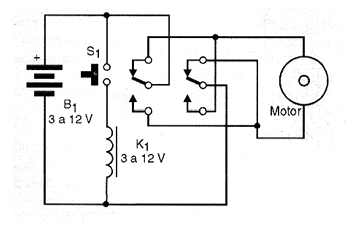 El circuito mostrado en la figura invierte el sentido de rotación de un motor mientras se presiona el interruptor S1. Vea que S1 puede ser tanto un interruptor de presión como un sensor de cualquier tipo (reed-switch, llave de fin de carrera, sensor de tacto, etc.). El relé usado debe tener la misma tensión usada en la alimentación del motor en este circuito, pero nada impide que el relé sea alimentado por un circuito externo de control. Si es necesario utilizar un capacitor para amortiguar los transitorios debido a la conmutación del motor, debe ser conectado en paralelo con la alimentación. Este circuito se puede combinar con otros mostrados en este artículo para obtener un comportamiento más complejo del sistema. El circuito se puede utilizar como shield que viene del mando del relé por la salida de un microcontrolador.
