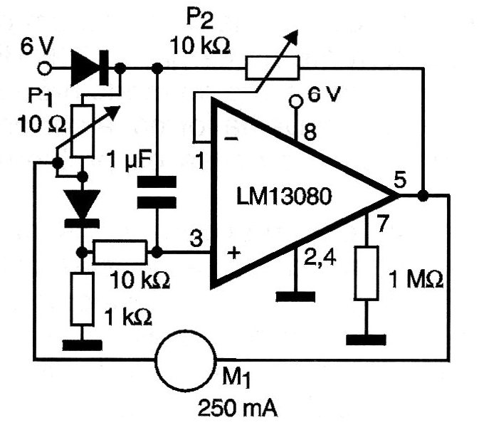 El circuito suministrado permite el control directo de un pequeño motor de corriente continua de hasta 250 mA. El componente básico empleado es un amplificador operacional de potencia que, en este caso, se alimenta con una fuente simple de 6 V. El control se realiza en los dos potenciómetros, siendo que P1 determina la referencia de velocidad. El diodo es de uso general y los demás componentes no son críticos.