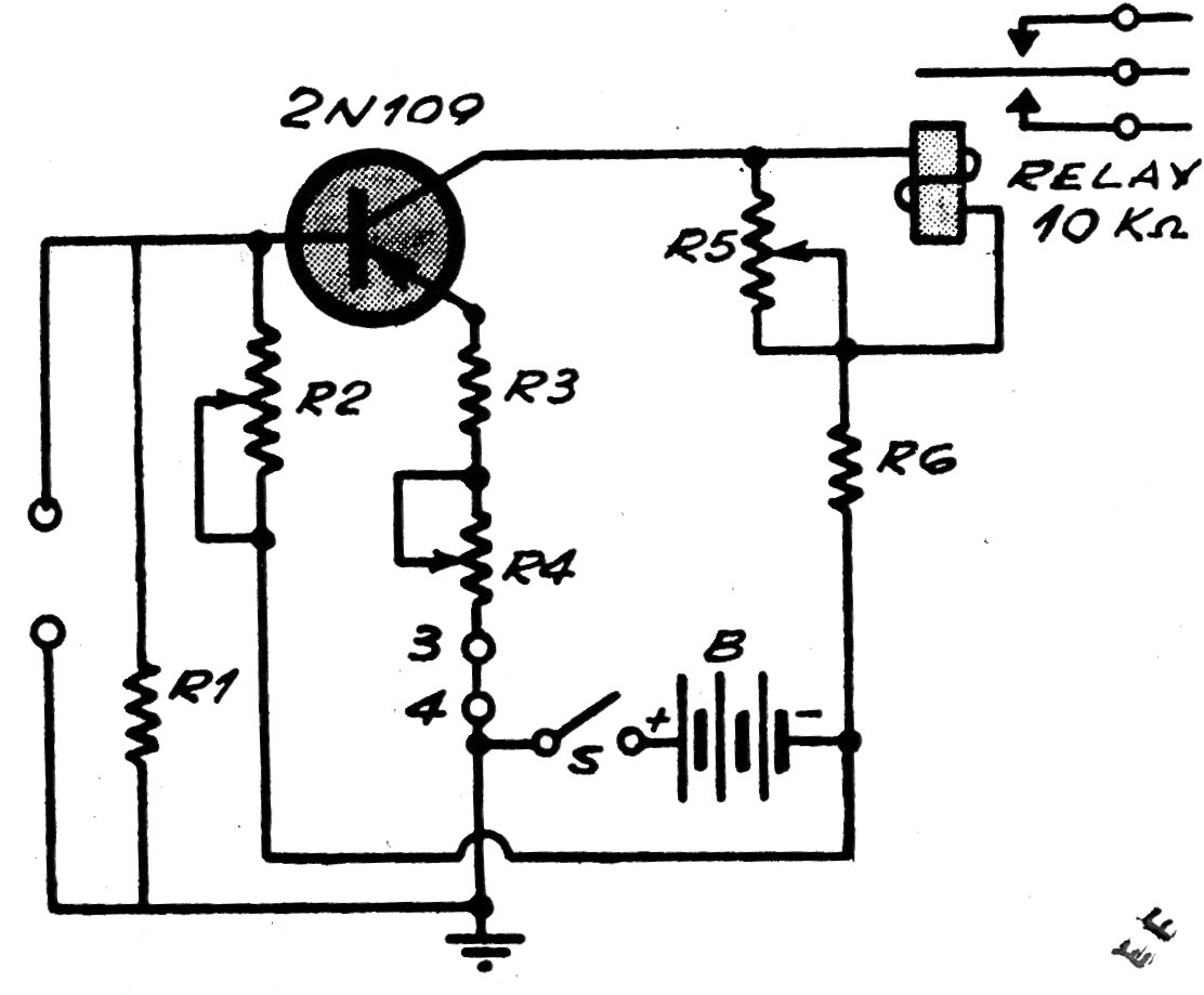 Encontramos este circuito en una documentación argentina de 1973. El transistor admite un equivalente más moderno y el relé es de 22,5 V sensible. El circuito puede ser alimentado con 12 V con el uso de un relé para esta tensión y eventual cambio de R6 que debe tener su valor reducido.