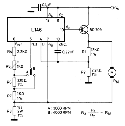 Encontramos este circuito en el manual de circuitos integrados lineales de la SGS de 1982. El circuito está integrado es poco común actualmente y el transistor puede ser sustituido por equivalente de acuerdo con el motor.