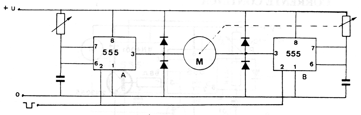 En la figura tenemos un circuito que utiliza dos 555 para controlar el posicionamiento de un motor tipo servo. El potenciómetro utilizado depende del tipo de motor y está acoplado mecánicamente al eje del motor. Los potenciómetros tienen valores típicos entre 10k y 470k y los capacitores entre 47 nF y 470 nF.