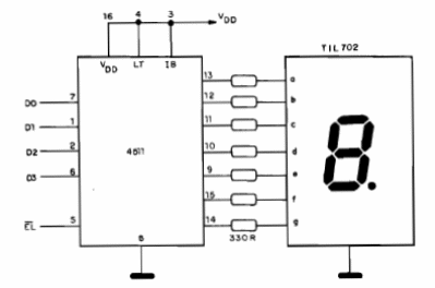 Si bien 7 salidas de un Arduino pueden ser usadas para excitar un display de 7 segmentos, o aún más displays con multiplexación, esta solución requiere sólo 4 salidas o 5 con clear, pues los datos son codificados digitalmente. El siguiente circuito muestra cómo utilizar el 4511, un decodificador CMOS de 7 segmentos para display de cátodo común. Los resistores pueden ser de 330 ohms o 470 ohms y la tensión de alimentación del circuito quedará en 5 V para los microcontroladores comunes. Las entradas deben ser hechas por niveles lógicos TTL y la entrada CL limpia o se cierra la esfera.