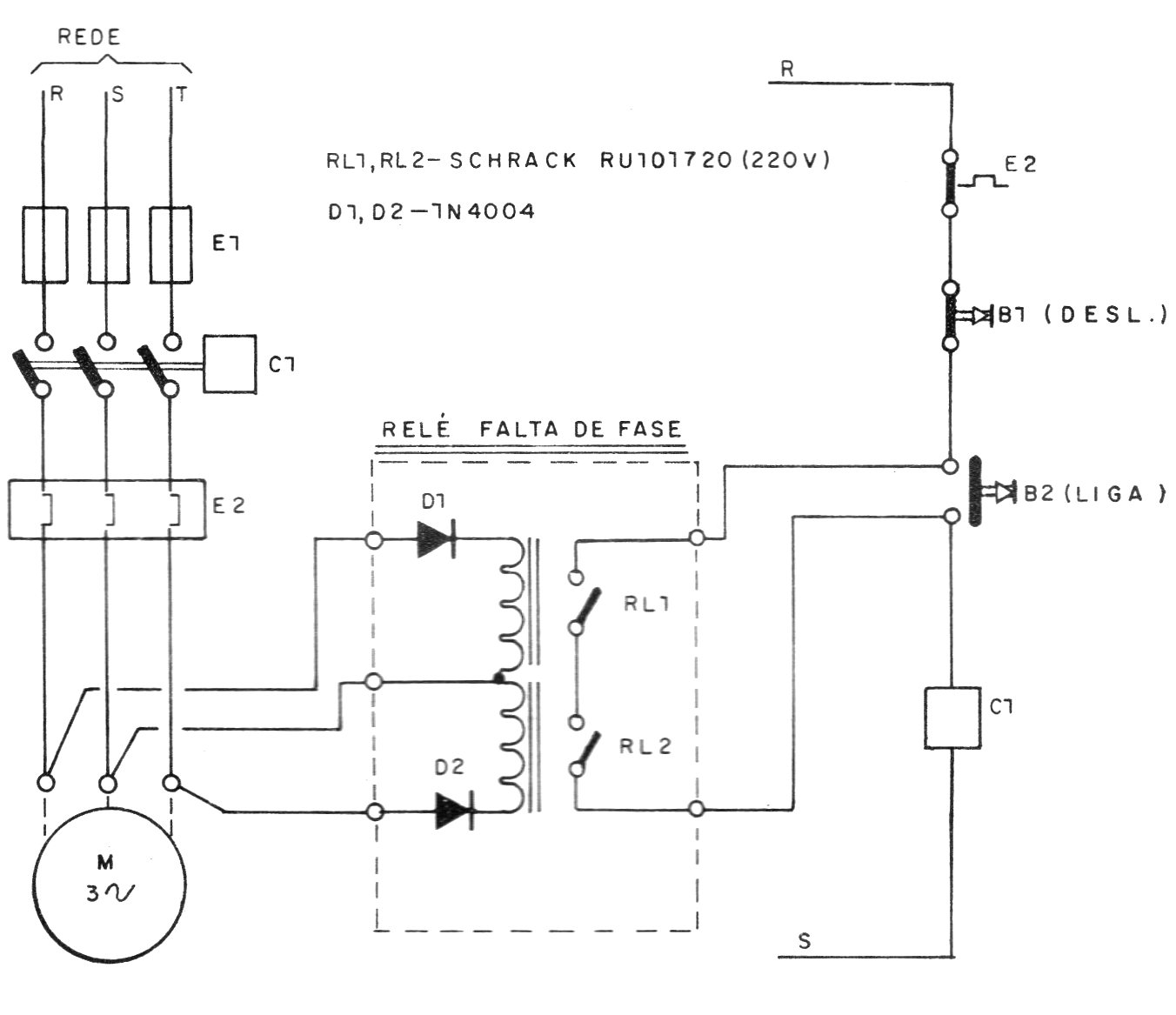 Encontramos este interesante proyecto en una publicación de 1987. El circuito acciona relés que hacen sonar una alarma en caso de la falta de una de las fases de alimentación. B1 y B2 controlan el circuito. Los relés son del tipo para tensión de las fases del motor.