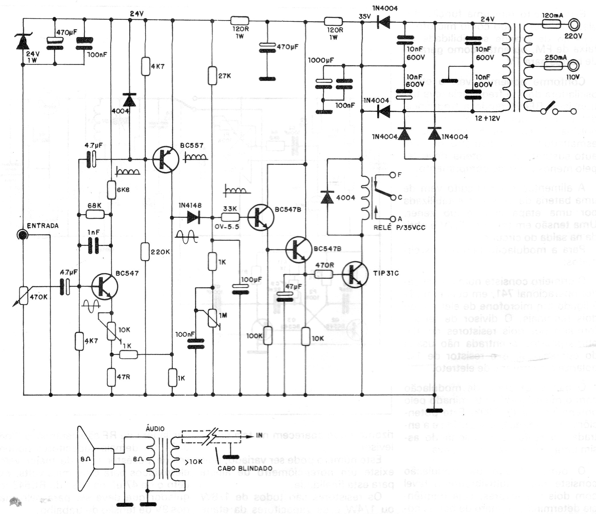 Este circuito de activación de carga por ruido ambiental se obtuvo en una publicación de 1987. El circuito tiene ajustes de sensibilidad en dos potenciómetros y el relé es del tipo sensible a 24 V. El transformador tiene una corriente de al menos 150 mA y se puede utilizar un pequeño altavoz como micrófono, conectado a un transformador de salida de transistores para un mejor casamiento de impedancias.