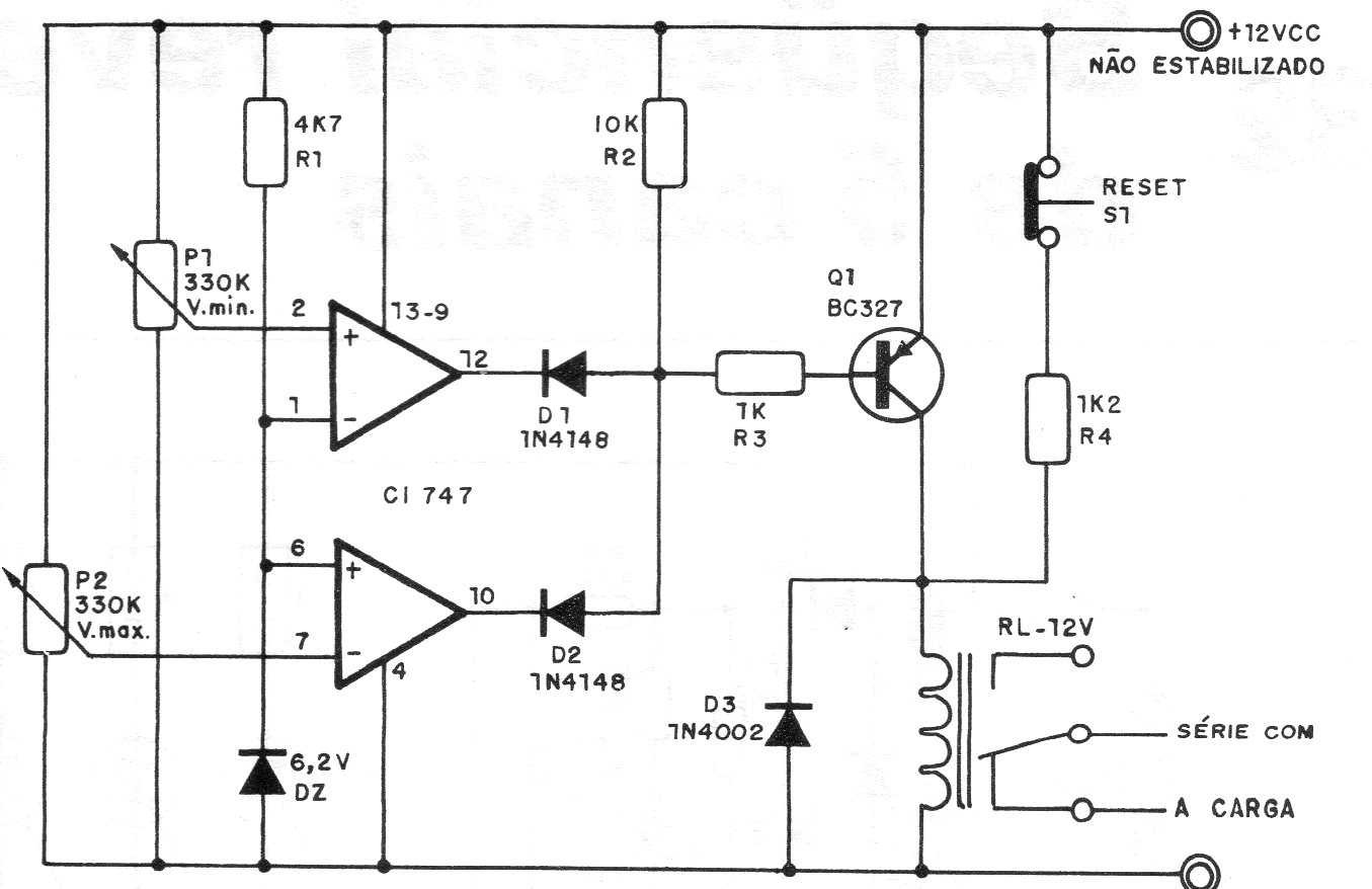 Este circuito sirve para monitorear la tensión de una red mediante la reducción de una fuente no estabilizada. Los potenciómetros ajustan el rango de tensión de actuación, es decir, los puntos de mínimo y de máximo. El relé debe ser de 12 V para una alimentación que deba ser controlada entre 10 y 15 V, por ejemplo.