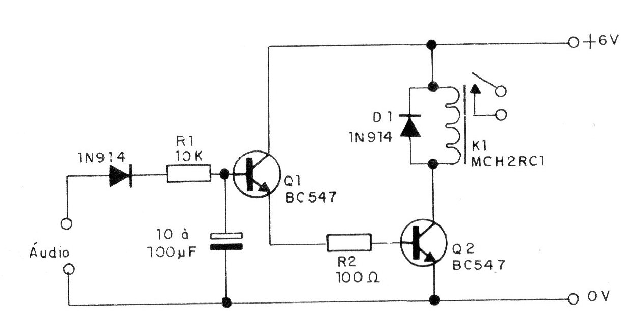 Este circuito se puede utilizar para accionar un relé desde un tono de audio. El tono puede ser, por ejemplo, pulsos de un control PWM, sin importar su frecuencia. El relé es del tipo sensible para 6 V. El capacitor debe elegirse de acuerdo con la aplicación.