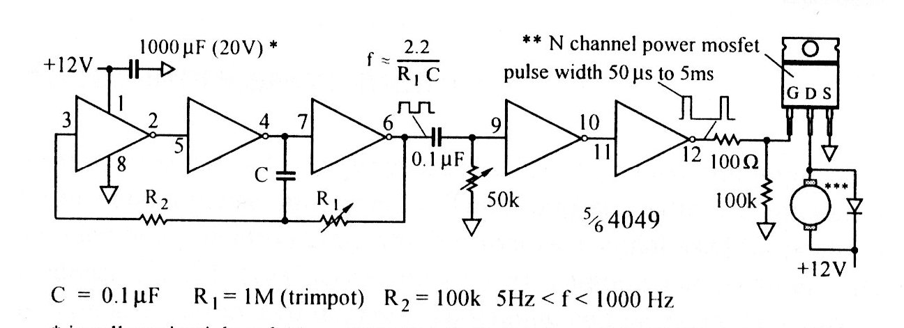 Con este circuito es posible controlar tanto la anchura de los pulsos como la frecuencia de la señal aplicada en el control de un motor de corriente continua. El transistor debe elegirse de acuerdo con la corriente del motor. Este transistor debe estar dotado de disipadores de calor. El circuito es de un libro americano de los años 90.