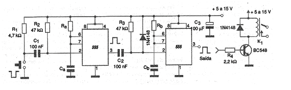 La finalidad del circuito práctico mostrado en la figura es generar un pulso de duración programada después de un cierto tiempo, también programado. El circuito puede tanto generar el pulso de intensidad dada por la tensión de alimentación para uso directo, como puede accionar un relé, para una interfaz de mayor potencia, o incluso el control de un automatismo.