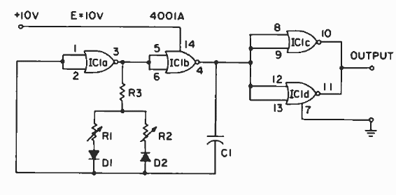 Este circuito genera pulsos con la relación marca-espacio ajustada en R1 y R2 que son potenciómetros de 470 k. La frecuencia va típicamente de 10 a 2 500 uF con un condensador de 100 nF y de 4 a 700 Hz con un capacitor de 220 nF. La alimentación se puede realizar con tensiones de 6 a 12 V.