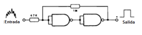Un resistor de realimentación positiva de 1 M hace que dos puertos NAND comunes de un circuito integrado 4011 en un disparador, con acción que posibilite la eliminación de repiques en señales dotadas de variaciones rápidas como de contactos de sensores, etc. El circuito puede ser alimentado con tensiones de 3 a 15 V y opera en frecuencias hasta unos 10 MHz, dependiendo de la tensión de alimentación.