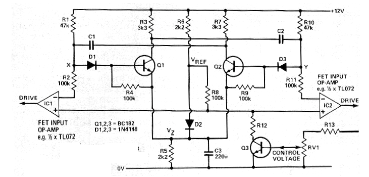 Este circuito salió en una revista inglesa, de mayo de 1995. La revista ya no existe, pero el circuito todavía es actual, pudiendo ser montado con facilidad, pues todos los componentes están disponibles. La entrada de control se realiza por una tensión de 12 V que se ajusta en RV1. Los transistores pueden ser BC548. La frecuencia es dada por C1 y C2. En la sección de matemáticas para electrónica, cómo calcular la frecuencia de este circuito.