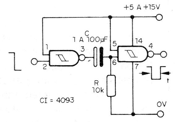 Este circuito sirve de base para aplicaciones como timers y alarmas, siendo su base dos de las cuatro puertas disparadoras Schmitt contenidas en un integrado CMOS 4093. Con la transición del nivel alto al nivel bajo de la señal de entrada (que debe ser mantenido), el monoestable se dispara, y su salida del nivel alto al nivel bajo, y manteniéndose en ese último nivel, por tiempo que depende de R y C (aproximadamente t = 1,1 x R x C). Después del intervalo determinado por los componentes, el nivel de salida vuelve a la tapa. El valor máximo de C es alrededor de 470 uF mientras que R puede asumir valores tan altos como 2 M ohms.