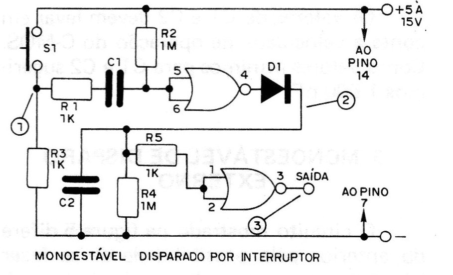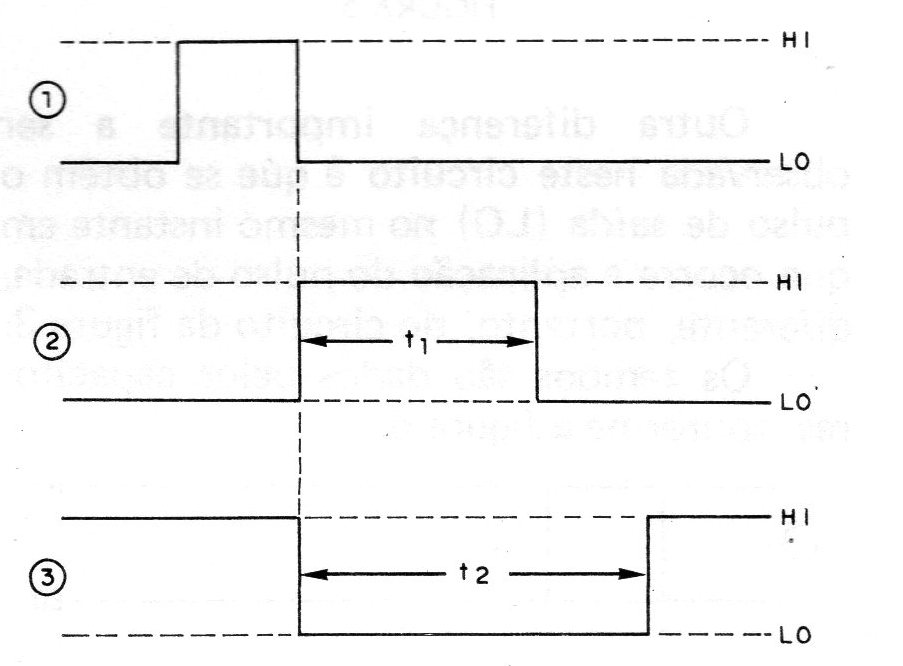 Este circuito permite obtener un pulso de salida independiente, en duración, del tiempo de acción sobre el interruptor S1. Una aplicación posible es en contadores, para eliminar el rebaje de los contactos del interruptor, que puede ser responsable de la producción de un tren de pulsos en lugar de un solo, al ser presionado. Se utilizan en este caso dos de las 4 puertas NAND del integrado 4001. El diodo D1 es de uso general 1N4148. Compruebe que los pines 7 y 14 se conectan a la fuente de alimentación. Es conveniente acercarse a las entradas de las demás puertas del integrado, si no las utilizan. En la misma figura mostramos los tiempos obtenidos para las señales en este circuito. El tiempo t1 depende del valor del capacitor C1, mientras que el tiempo t2 depende del valor del capacitor C2. Una característica importante de este circuito, a ser observada, es que la salida, normalmente en el nivel HI, permanece un cierto tiempo t2 en el nivel LO después de terminado el impulso producido por el interruptor S1.