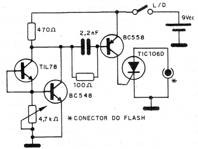 Este circuito está diseñado para el disparo de un flash auxiliar con lámpara de xenón como sigue siendo utilizado por los fotógrafos profesionales para no obtener sombras. El circuito es de una documentación de 1995 y el foto-transistor puede ser sustituido por equivalente. La sensibilidad se ajusta en el trimpot.