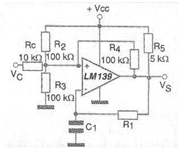 Una aplicación interesante y que se puede implementar con el LM139, es el modulador de ancho de pulso. No hay que decir que se trata de configuración de gran utilidad en el control de motores. En la figura tenemos el circuito que hace uso de apenas un comparador y tiene su frecuencia básicamente determinada por el capacitor C1. El resistor Rc determina la sensibilidad a la señal de modulación, pudiendo ser alterado conforme a la aplicación. Ver que este circuito actúa sobre el ciclo de generación de la señal en un oscilador de relajación modificando la tensión de referencia del divisor formado por R2 y R3. También es importante observar que la señal de salida es rectangular y que el circuito no necesita una fuente de alimentación simétrica. Los valores para el capacitor están en el rango de 1 nF a 100 nF.