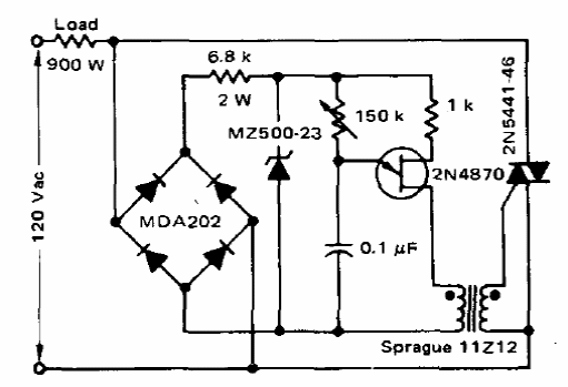 Este circuito genera dos disparos por ciclo de la tensión alterna para un control de onda completo. El circuito es de una publicación de Motorola de 1975, pudiendo usar triacs de la serie TIC y el unijunción puede ser el 2N2646. El zener puede tener tensiones de 15 a 25 V. La carga depende del Triac usado.